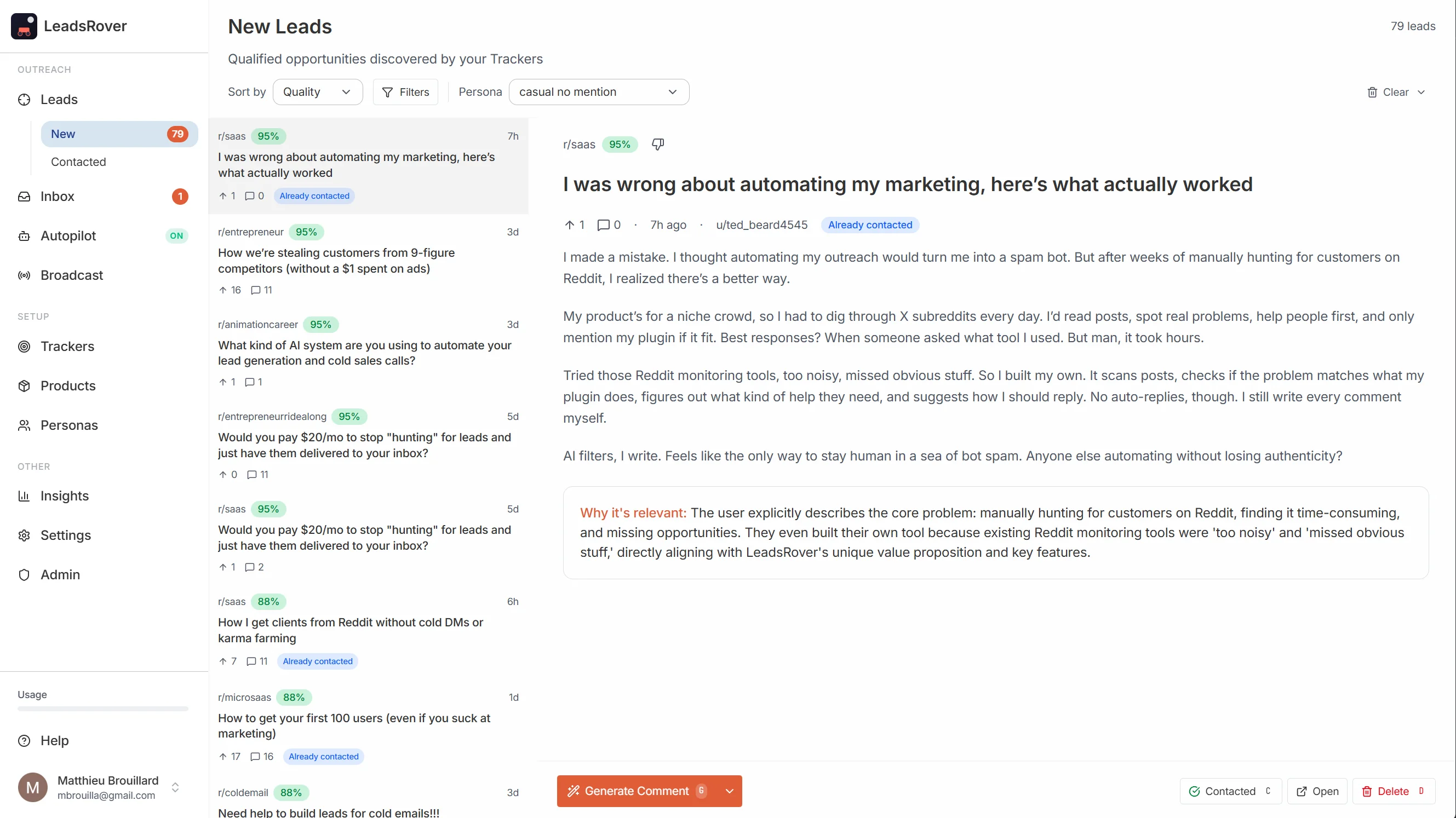 LeadsRover scans Reddit every hour and scores each post by how likely the person is to want your product. You see a ranked list. No scrolling through noise.